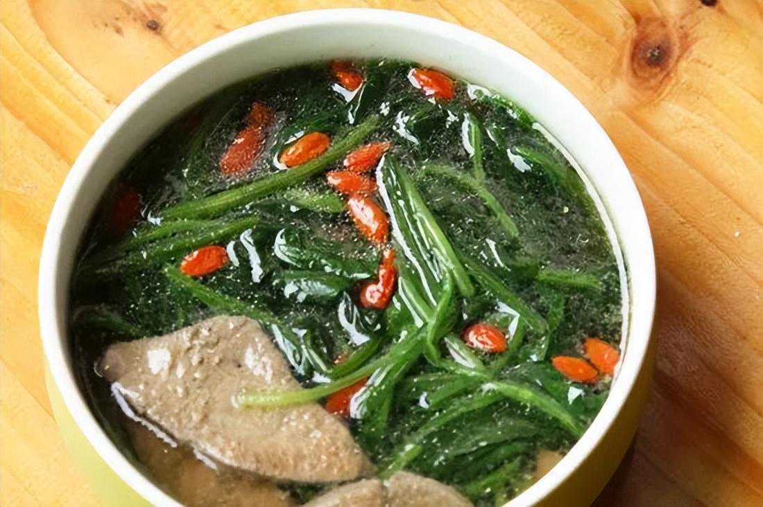 材料:春菠菜200克,枸杞子20克,猪肝250克,生姜3片。(2人份)