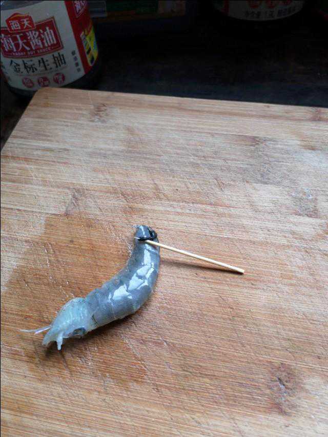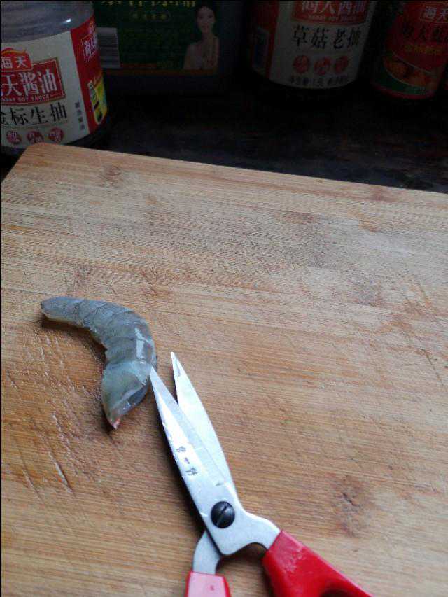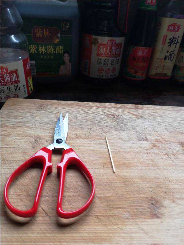 剪刀用来修剪虾,将虾头虾尾虾脚都剪掉,再将虾背从头到尾剪开,然后用牙签将虾肠仔细挑出来。