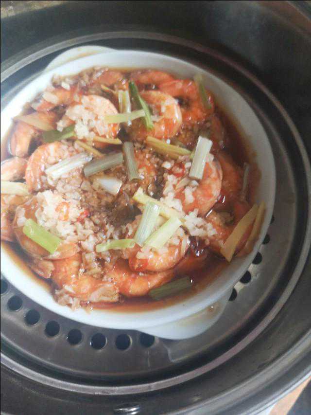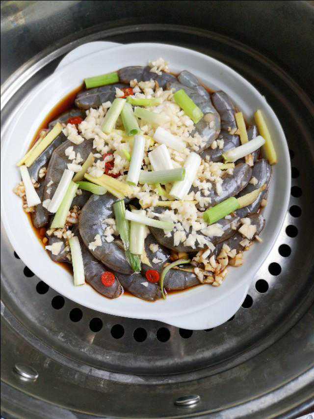 大虾淹制十分钟后,散上葱段,姜丝,蒜泥,将盘子放入蒸锅。