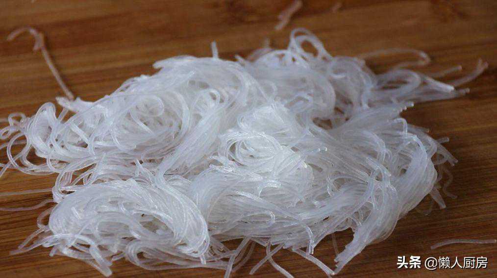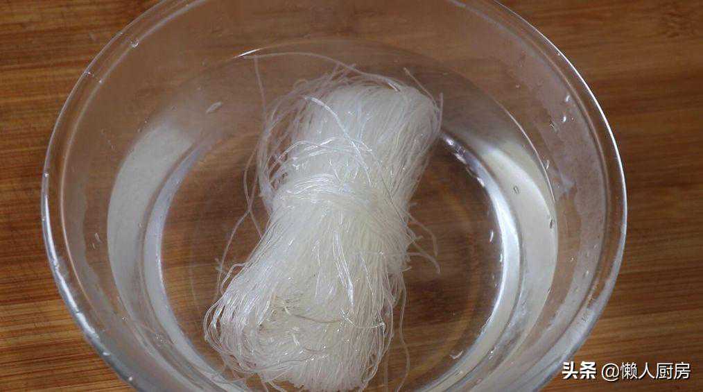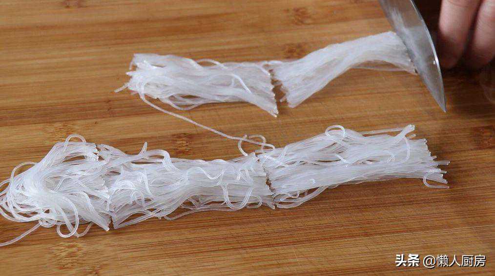将龙口粉丝放入热水中泡软,把粉丝切成小段。