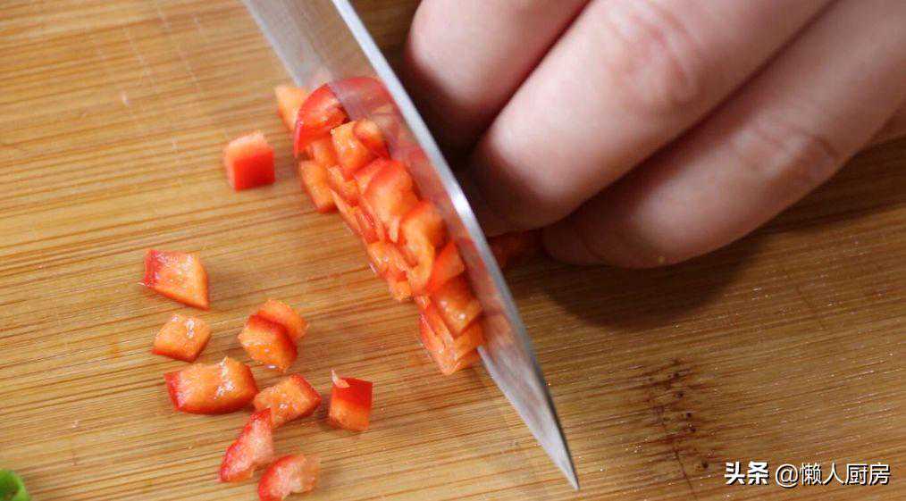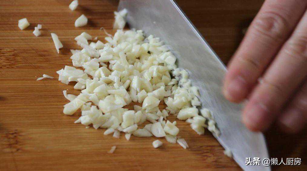 大蒜剁成碎末。小葱切成葱末。红椒切成末儿。