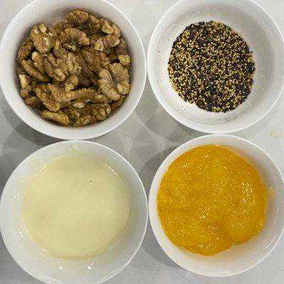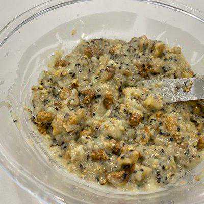 2、先将白巧酱和燕麦酱混匀,加入烤熟核桃仁和熟的黑/白芝麻