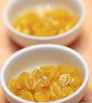 2.把漂洗过的白果肉下锅用水煮20分钟,去掉苦涩味,捞起漂洗后再煮一次。然后用沙锅一个,垫下竹算子,放进白果,加白糖500克,清水150克,用慢火熬约30分钟,取出。