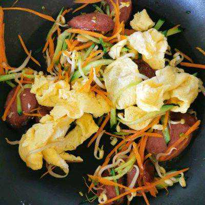 7、加炒好的鸡蛋,放一些红肠