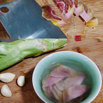 5、火腿肉切薄一点的片,切的时候刀与肉成30度角切入成斜片增加切面,肉片装碗,加入温水再加1汤匙黄酒浸泡半小时,去除火腿的咸味和因包装产生的异味