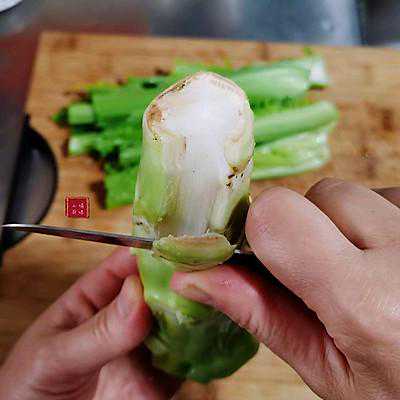 6、棒菜冲洗后,掰下叶茎,用小刀从顶端根部切入削掉绿皮及黄色的细茎丝,只留白的肉茎