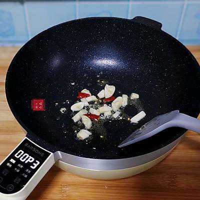 8、朋森电炒锅先加油、蒜碎、干辣椒段,再接通电源开烹饪P3档,炒出蒜和辣椒的香味