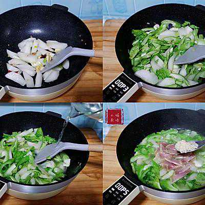 9、接通电源开烹饪P3档,炒出蒜和辣椒的香味,接着加入棒菜的肉茎块翻炒1分钟,然后加叶茎片翻炒,炒至食材变成鲜亮的翠绿色,倒入开水与食材齐平,放入浸泡好的火腿片,加入甜酒酿,翻拌均匀