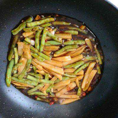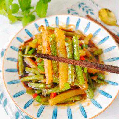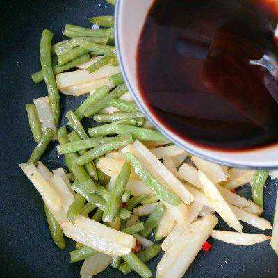 10、倒入煸炒好的土豆条豆角,加入料汁