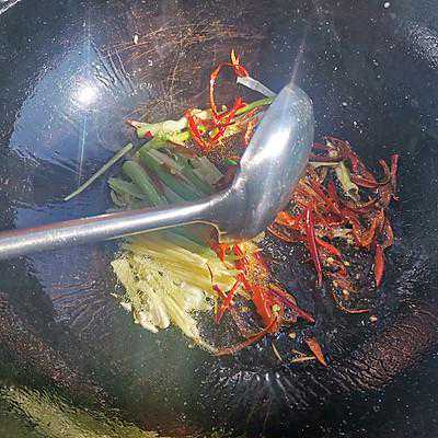 7、把佐料下锅炒香,下入炸好的杏鲍菇。