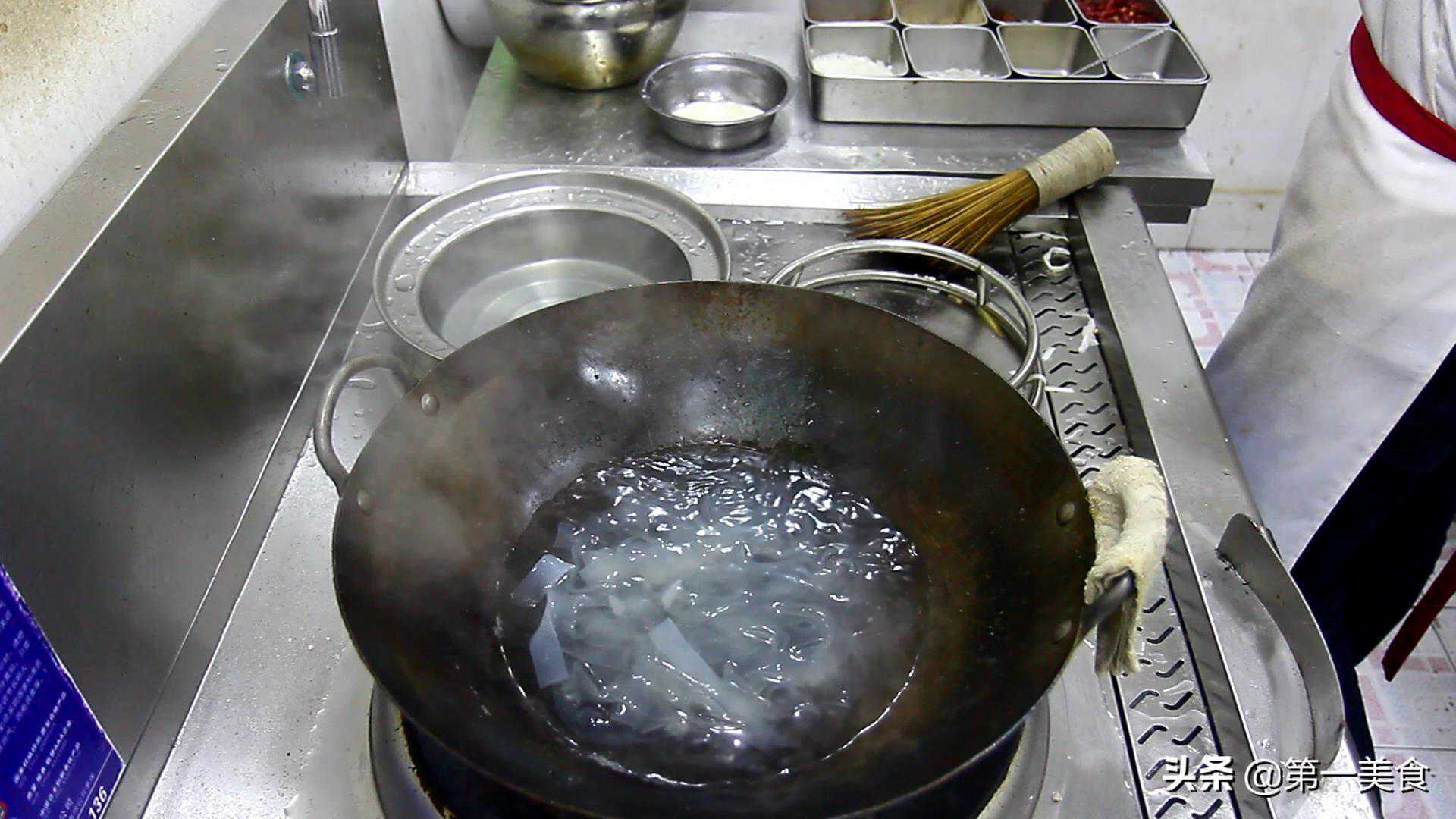 2.锅里倒入清水,开大火烧开,倒入大拉皮,焯水30秒钟捞出,用清水冲洗大拉皮,以免坨到一起。