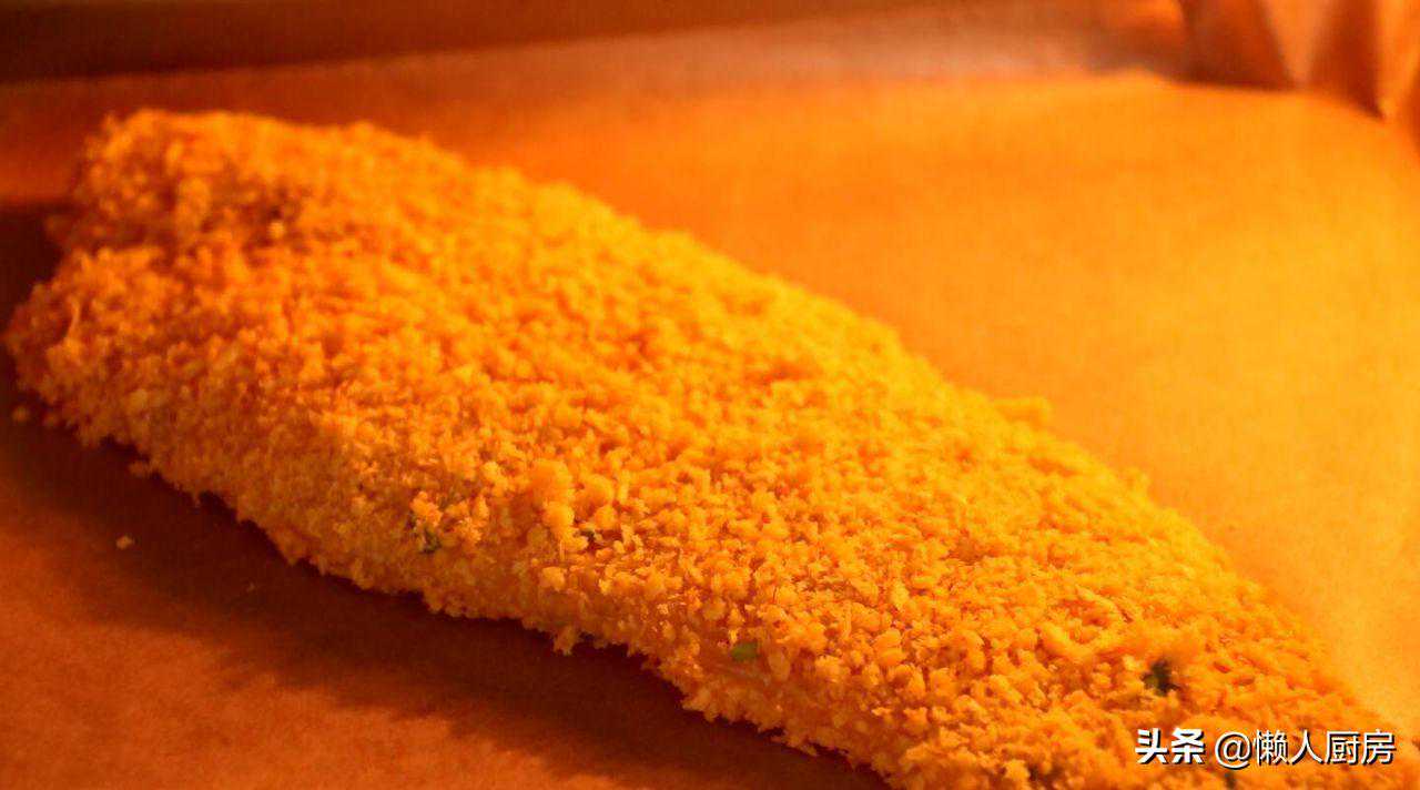 将面包糠撒在案板上,放入腌制好的鱼肉,两面都均匀地裹上一层面包糠。
