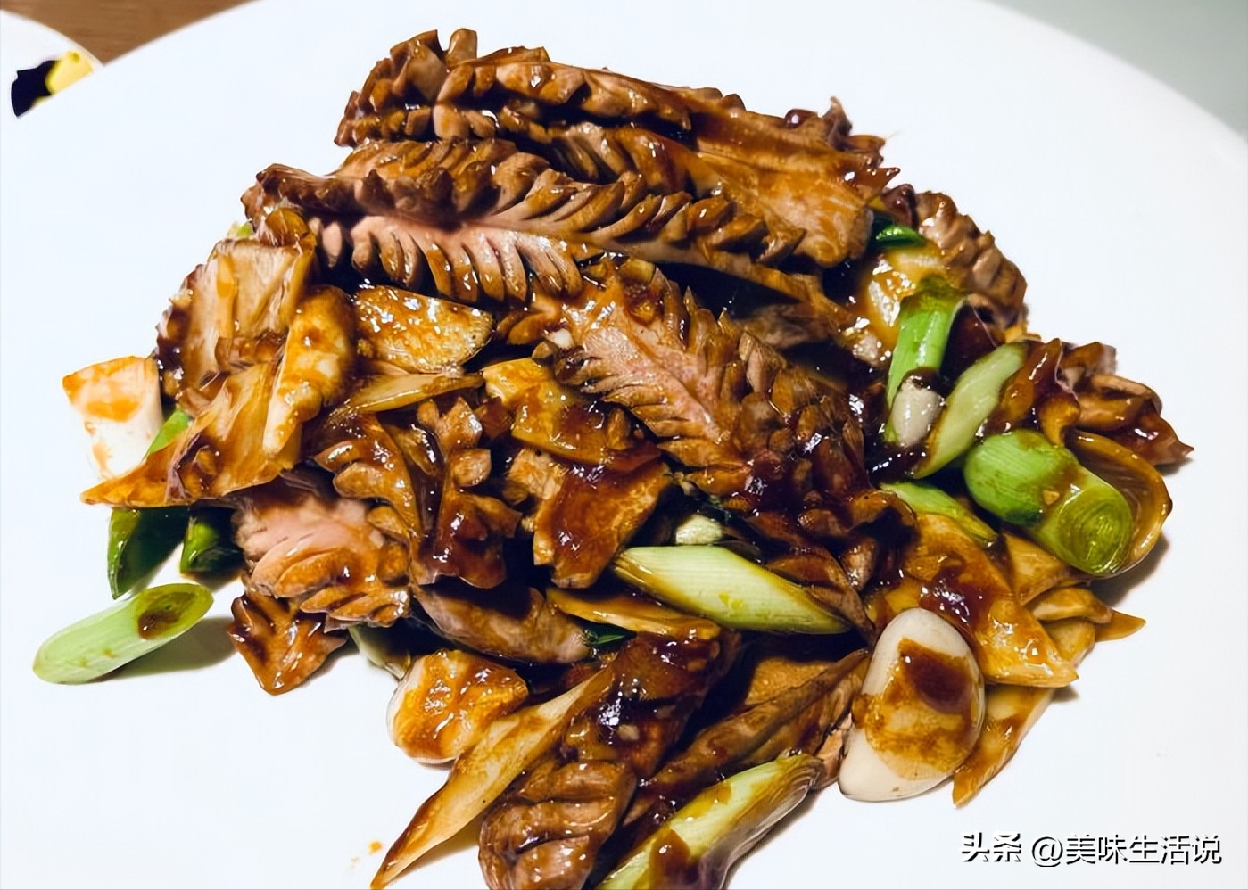 这是非常考验火候和刀工的一道菜。腰片处理的干净,没有腥臊味道。腰片切出纹理,中间还不能断。切好的腰花爆炒时充分的裹上酱汁,和大葱、蒜片一起爆炒,滋味浓郁嫩脆爽滑,很好吃的一道菜。