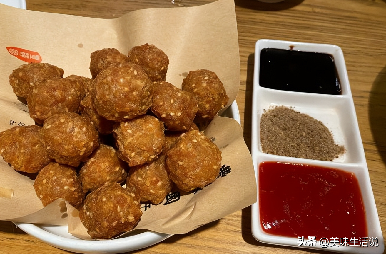 非常讲究火候的菜品,怎么能保持酥脆焦香的口感,丸子鲜香吃起来有颗粒感,三种蘸料搭配口感更加丰富,也算是不错的菜品。