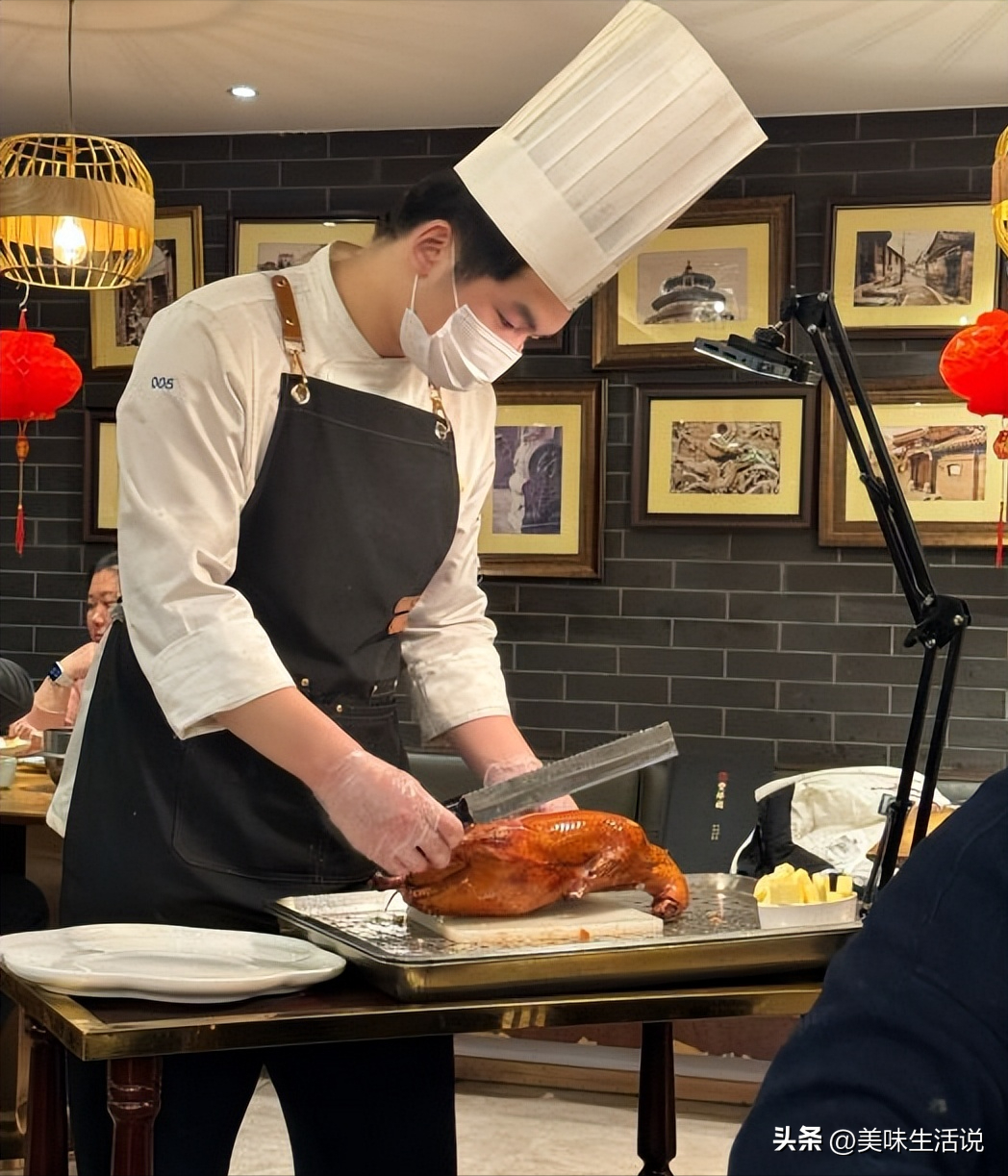 上桌前烤鸭师傅会把鸭肉鸭皮一片片用刀片好,然后摆出精美的造型上桌。