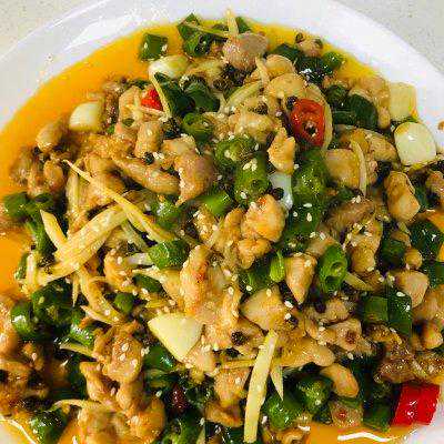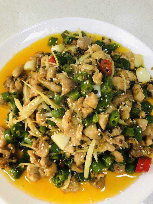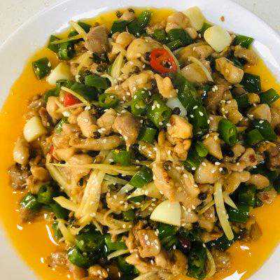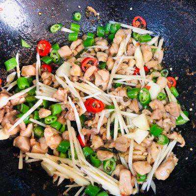 13、加入鸡丁,仔姜丝,鸡精,翻炒。尝一下味道,如果麻辣味不明显,也可加入花椒油和辣椒油增加风味。