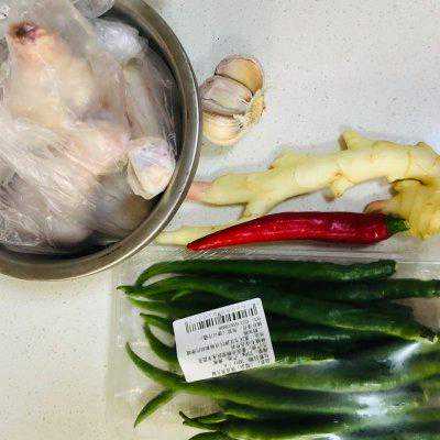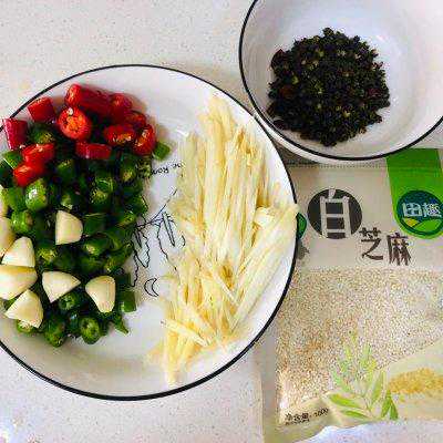 7、腌制时同步准备好配菜和配料。青红椒切丁,大蒜切成两半。仔姜切成细丝。也可以切丁更和谐。不过个人喜欢吃仔姜,“冬吃萝卜夏吃姜”,细丝更加好入口。青花椒和白芝麻备用。