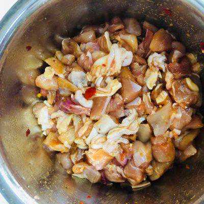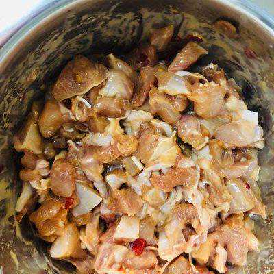 8、腌制好后,加入一勺淀粉拌匀,让鸡肉更嫩滑,口感更好。