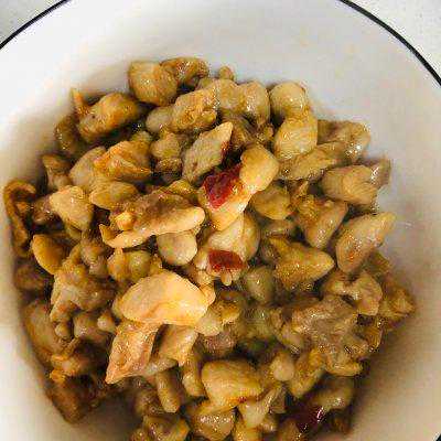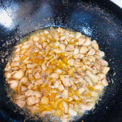 9、油热后倒入鸡丁翻炒2分钟。