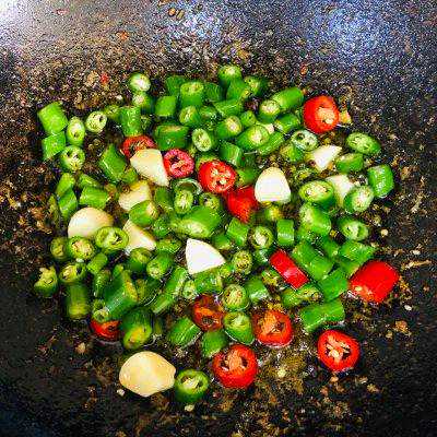 12、加入青红椒,大蒜,盐,中小火慢炒,炒出辣味。