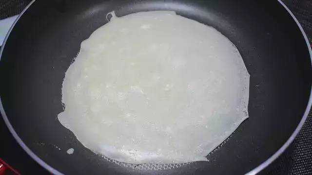 5、锅中刷一层油,舀一勺面糊,摊平,煎定型翻面煎,煎熟出锅;