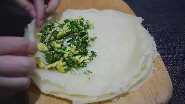 6、面皮放入韭菜鸡蛋馅,包成春卷的样子;