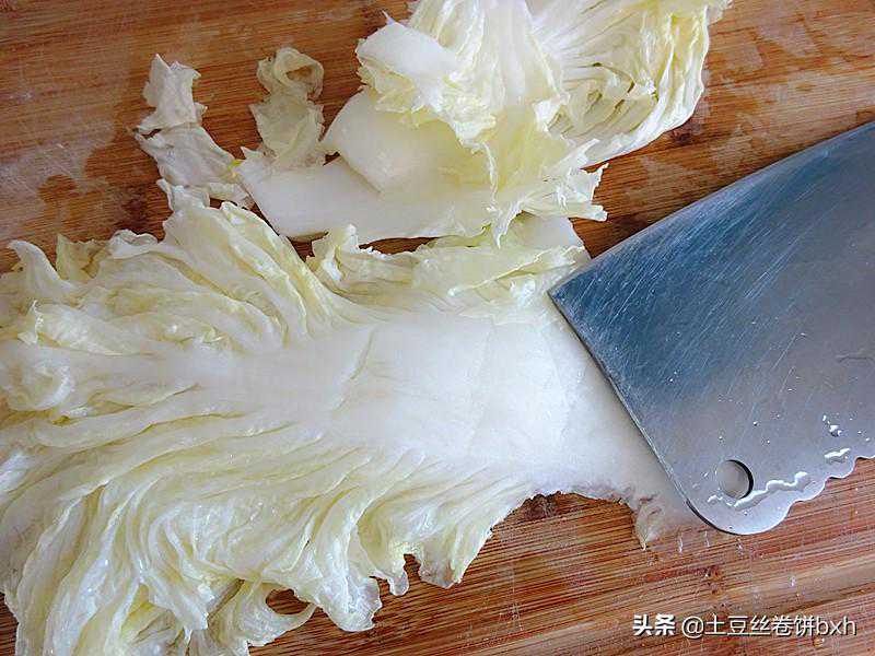 4、每个白菜帮先用刀背拍一下,菜帮的部分会自然拍散。