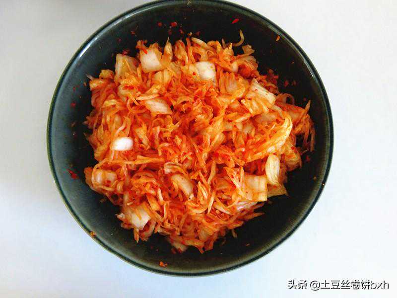 7、把萝卜丝和白菜块都攥出水分,放入妙拌酱,可以先少放,拌了在品尝后再加,一直到自己喜欢的口味就行了。