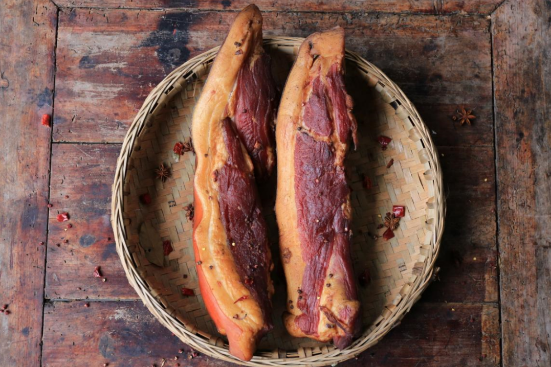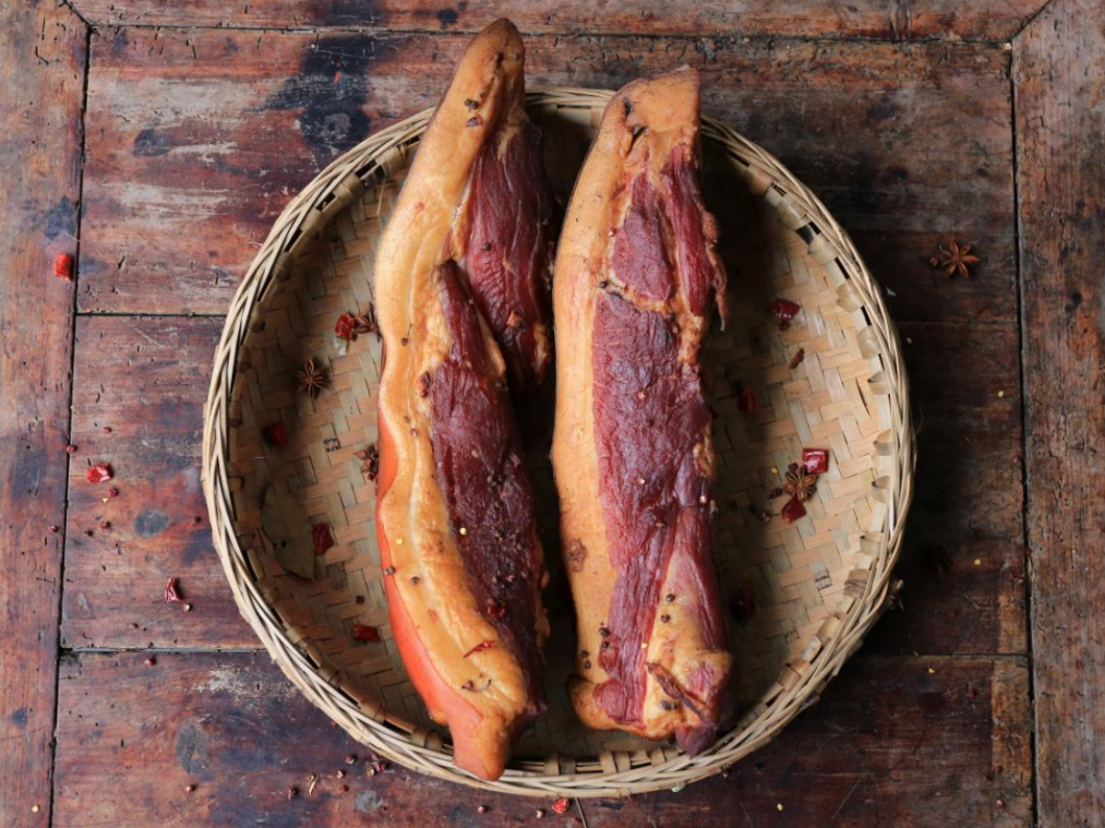 取花楸山山中青冈柴、柏枝、桃枝、柚子皮、核桃壳、茶籽壳等文火熏制整整一个月,直至腊肉颜色鲜亮、带有淡淡果木香。