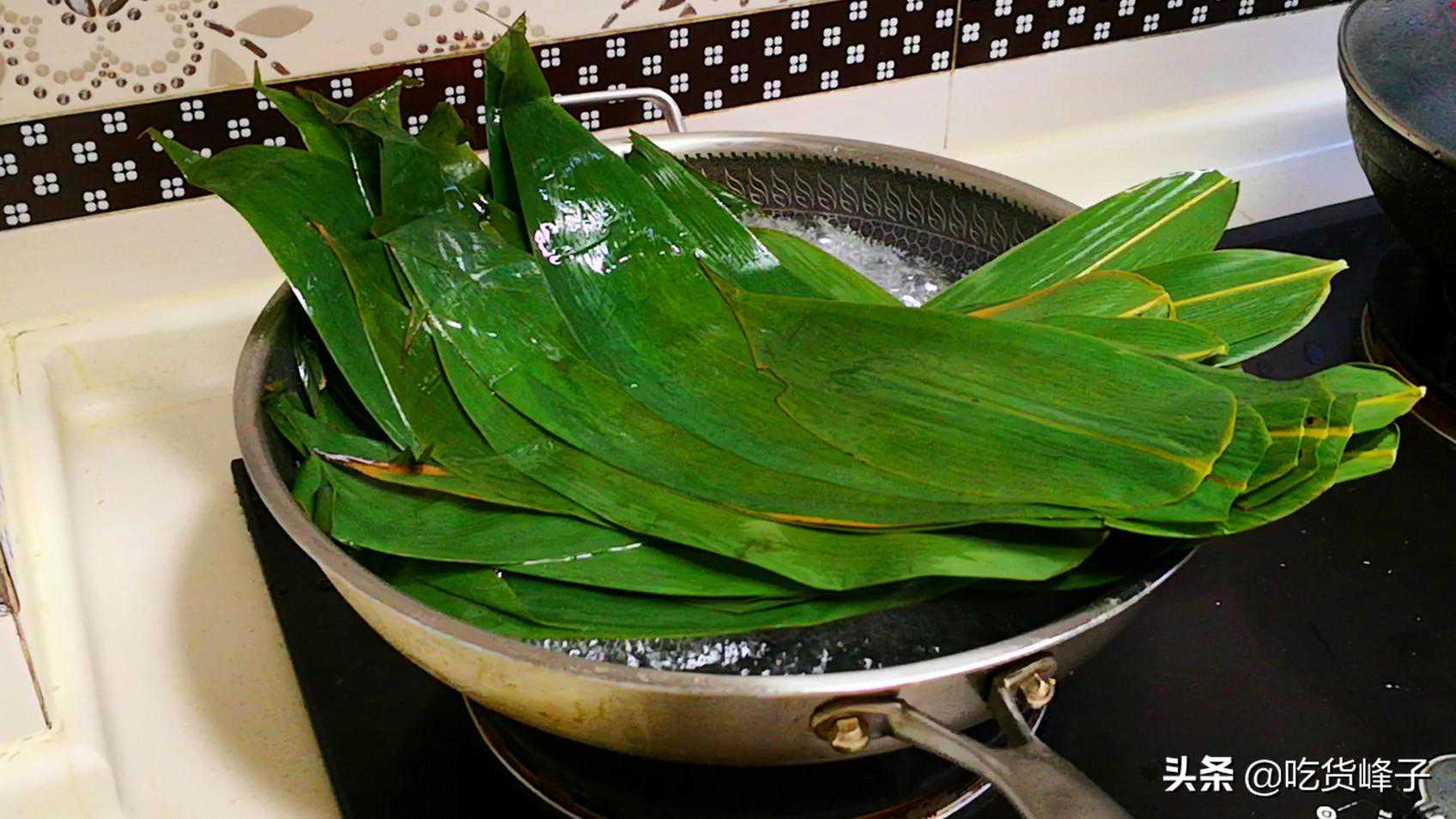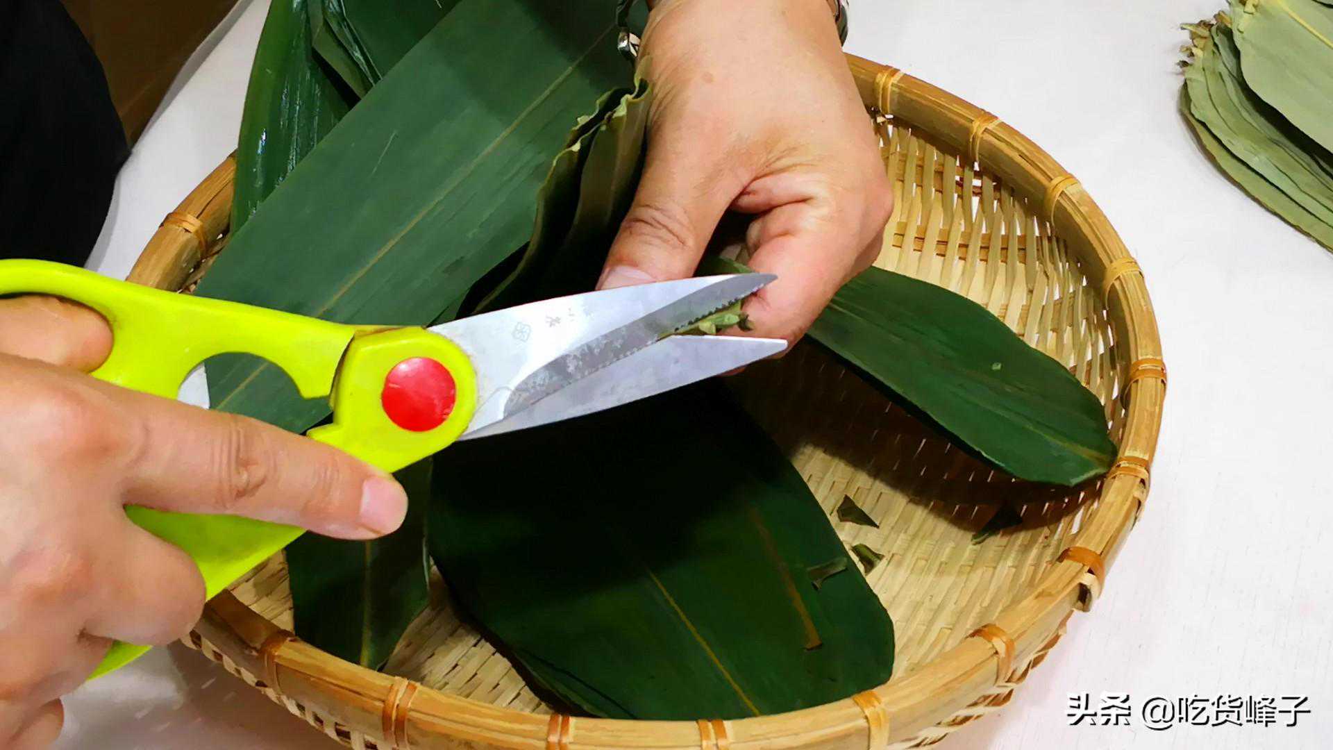 2.粽子叶我用的是鲜粽叶,先把尾部的梗剪掉,然后用清水冲洗干净,冲洗时要注意,动作要轻柔,小心别弄破粽叶。然后起锅加水,水开后放入1勺盐,盐起到消毒杀菌的作用,然后放入粽子叶大火煮3分钟,再捞出过一遍清水,控干水分后备用。