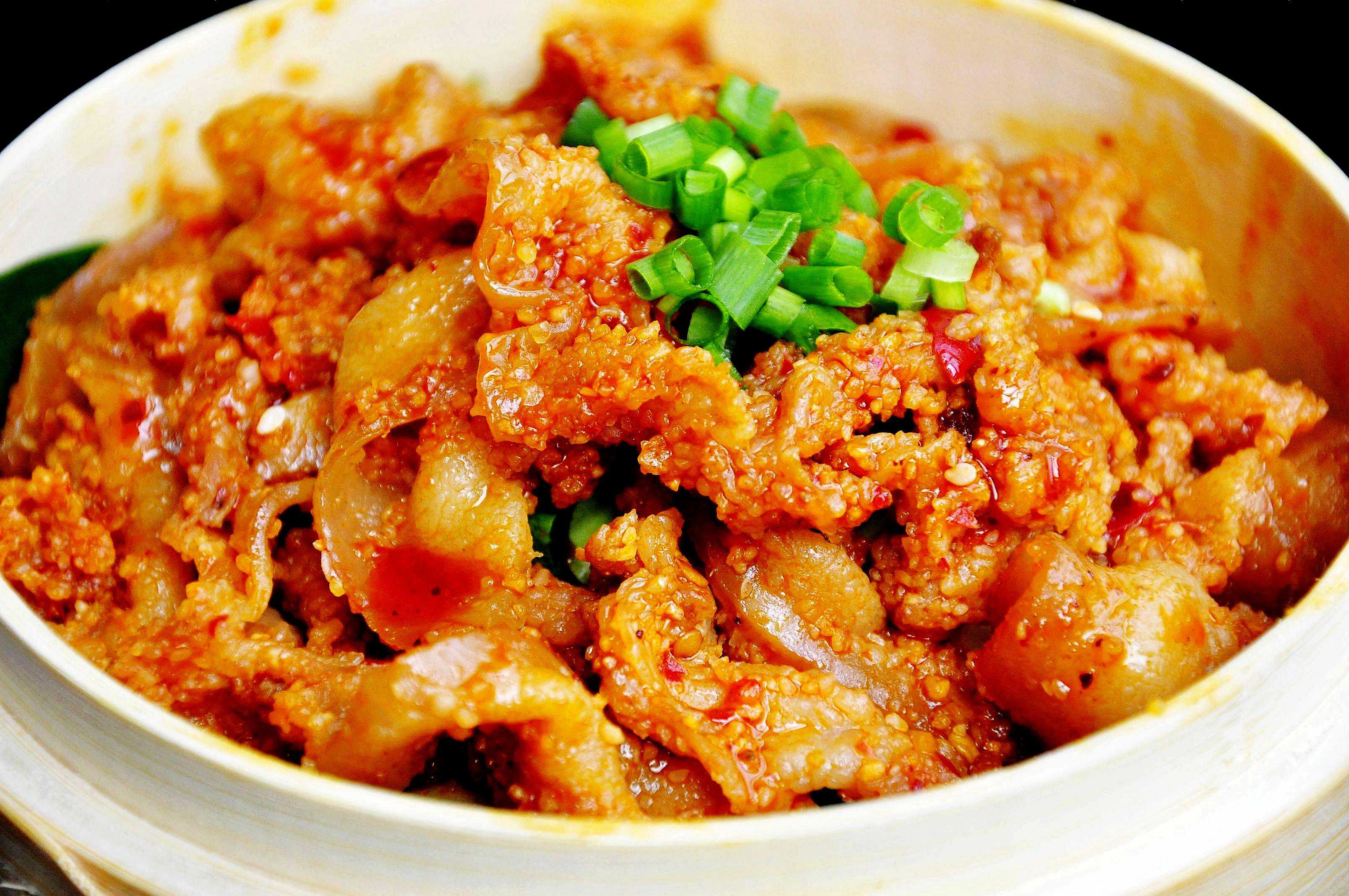 粉蒸,粉蒸蒸法,是川菜蒸制菜品一大创造,应用范围很广,但多用于荤菜。如粉蒸肉、粉蒸排骨、粉蒸肥肠、粉蒸牛肉、羊肉、粉蒸鸡、粉蒸鸭条、粉蒸鳝鱼、粉蒸牛蛙、粉蒸鲢鱼、粉蒸蹄花、粉蒸凤爪等,几乎款款都是川菜中的经典菜肴,颇受食众喜爱。其成菜柔软滋润、味浓而香、不腻不柴、吃口爽美。
