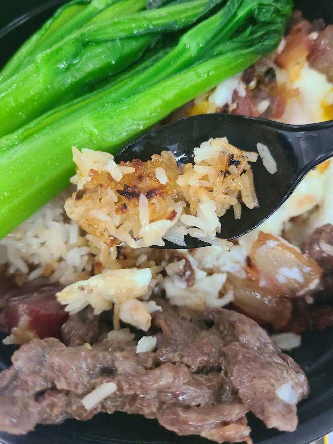 因为工作原因,一直没有登门堂吃,偶然点过一餐外卖,出品据说不差堂食。重点来了,前文一切形容饭焦有多好吃的语言,都是以超记为原型描述的。浅金色的饭焦在饭盒里是有些委屈的,因为它本属于煲仔。但它没有因此放弃追求完美的目标,一口下去,依然香脆沁甜。