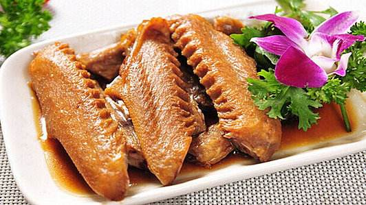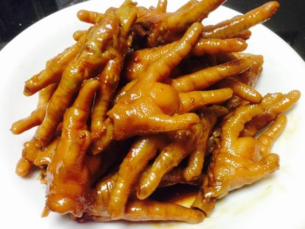 做法:冷水焯2min至开,拿出来温水洗洗,锅放水没过料,加老抽,盐,桂皮,花椒,大料,糖,干红椒,酒,姜,大火烧开后小火炖至快干了(约半小时),中火看着收汁。同样来卤鸡爪也是可以的