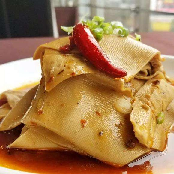 做法:豆腐干洗净,焯水一分钟,晾干或者擦干,取一块豆腐干,沿上下两边各摆放一根烧烤用的竹签,先切竖刀,不要切断,切到豆腐干厚度的三分之二处即竹签的位置停下,一块豆腐干可以竖切12刀,每一刀间隔约2毫米切完后翻面,切斜刀,同样切到三分之二处,斜切约16刀切完后拉开后的豆腐干是原来的两倍长,风干1小时可以用竹签撑开,也可以放漏篮中晾干起油锅,油热后放豆腐干炸至两面金黄捞出沥干再用厨房纸吸去多余的油分。