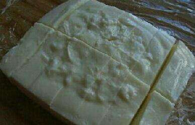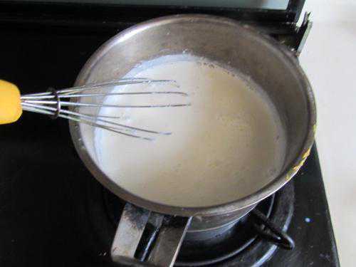 2.锅内加入另一半牛奶烧沸,加白糖调味,将奶浆慢慢倒人,边倒边搅拌均匀,待锅内牛奶成糊状,淀粉完全熟透,起锅倒入抹油的平盘内,自然晾冷,放入冰箱冷藏,成菜前取出,切成一指条宽。