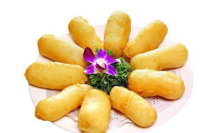 3.调节好脆浆的松泡度、干稀度,加油,将奶条逐条粘上脆浆,放入七成热的油锅中,不断翻炸,直至奶条外表膨松胀大,色泽微黄,奶条热透变软,外表松脆才捞出。修剪去成形不规整的四边,装入盘内,与配好的炼乳和茄汁同上,由食客自行蘸食。