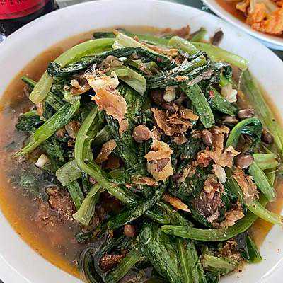 2、油麦菜洗干净备用,热锅凉油放入罐头炒,再放入豆豉和蒜炒香,放入油麦菜加盐,生抽炒熟即可。