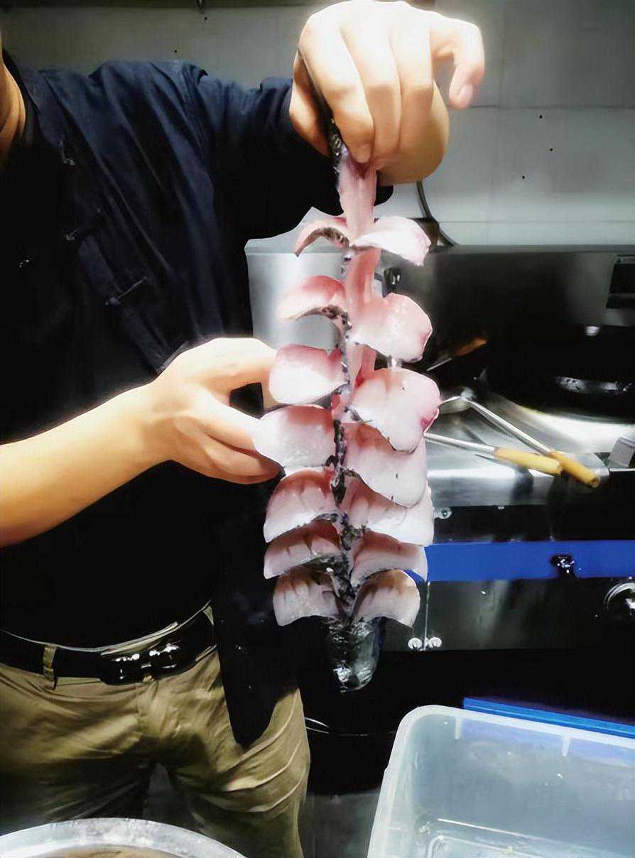 李盛开做的脆皮鱼只选草鱼,草鱼的身材更修长,鲤鱼的更扁平,从成菜造型上看,草鱼比鲤鱼更容易立起来,造型更好看。此外,草鱼的脊背肉更厚实,鲤鱼的脊背肉更单薄,在给鱼身剞刀时,草鱼的连刀鱼片厚薄均匀,造型美观,而鲤鱼的则要差些。李盛开剞鱼采用牡丹片刀法,也非常适宜草鱼的鱼型,可以说是为草鱼量身定做的吧,即先直刀在肉厚处剞至刚到鱼骨,再平刀向鱼头方向推进。这样剞出来的鱼形更加饱满、完美。