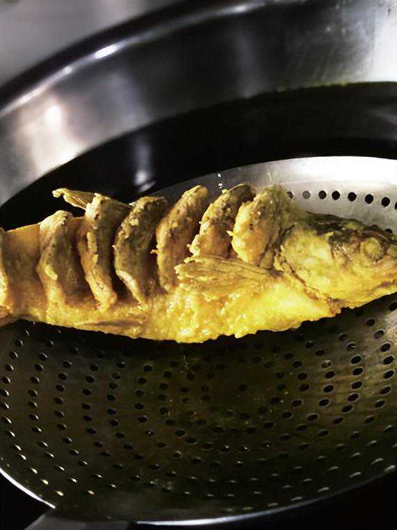 锅留底油,将白糖、醋、酱油、姜、蒜、泡海椒、水豆粉与鲜汤调成汁水,倒入热油锅收汁亮油,起锅淋在鱼身上,撒上葱丝即成。此菜皮脆肉嫩,味酸甜鲜美。