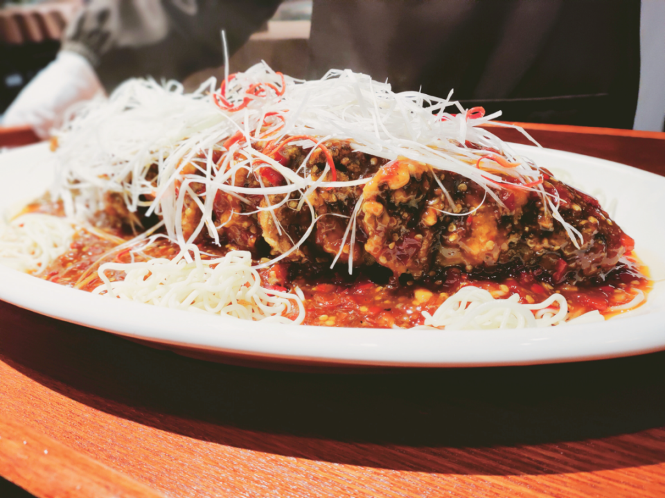 一盘汁红油亮的鱼肴上桌,阵阵香味迎面扑来。乍一看,鱼肴整体硕大、完整、对称,细刀条块的鱼身金黄硬挺,滋汁金红,缕缕葱丝、泡椒丝顺着鱼身飞泻而下,与摆在周围的面条交织在一起,葱的白、椒的红、面的黄,构成一道艳丽的立体画面。细一品,鱼皮脆而不焦,鱼肉纯白细嫩,略蘸滋汁,咸鲜酸甜香五味俱全,糖醋味尤为突出,跃然舌尖。