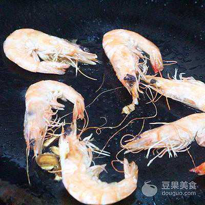 2、锅里放适量的油,放入大虾,烹点料酒,炒熟盛出。