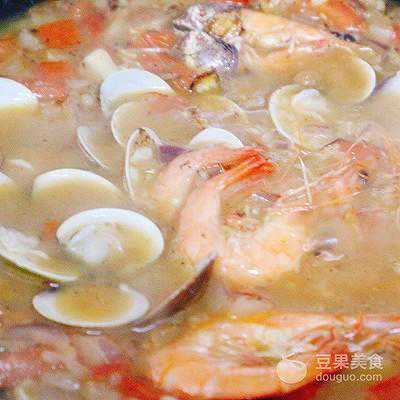 5、加入鱼汤,放大虾和贻贝、文蛤,大火煮沸后,转为小火煮10~15分钟,直到米饭熟透。