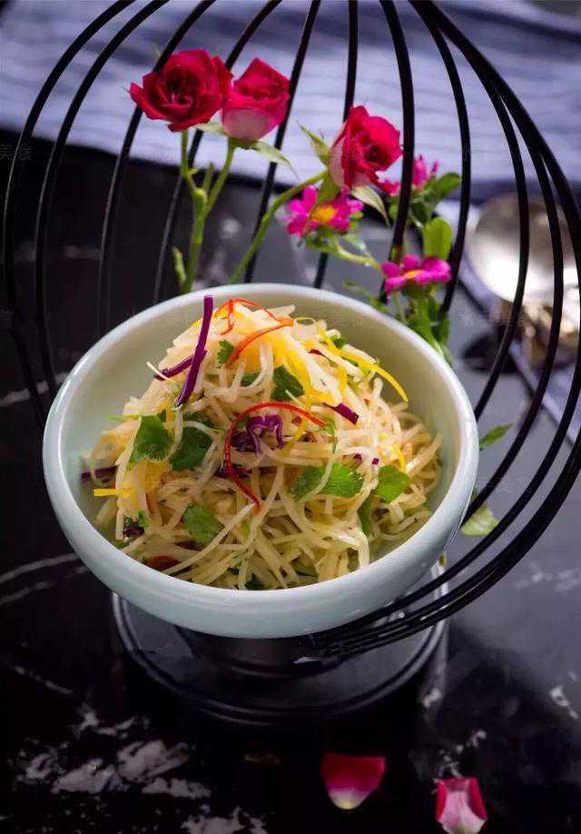 这款大拌菜的汁用料很简单,但是味道却非常讲究。味汁的甜味来自于自制的糖汁,加工时加入了少量白醋和柠檬块,带有淡淡的果香味。