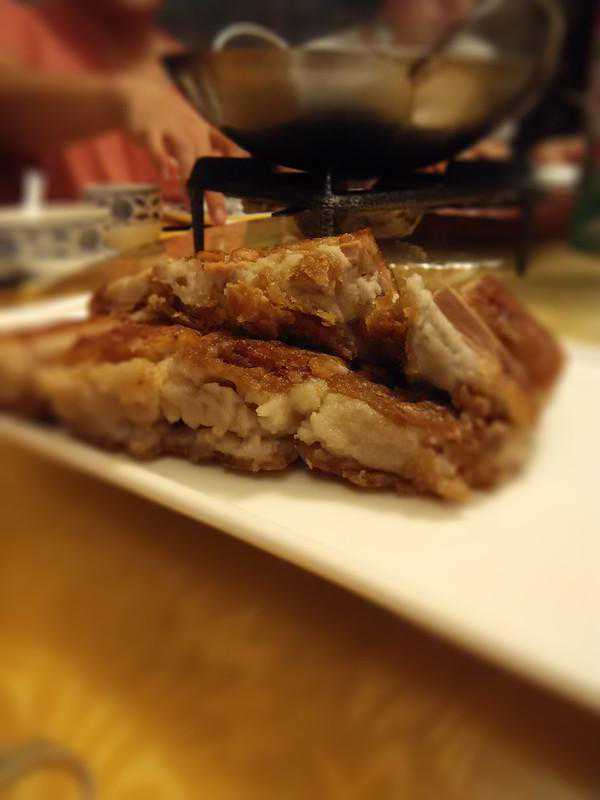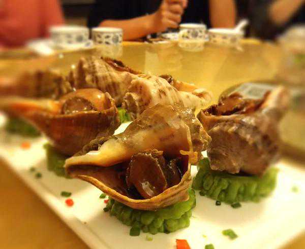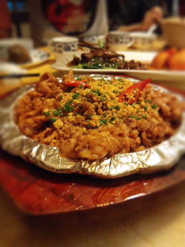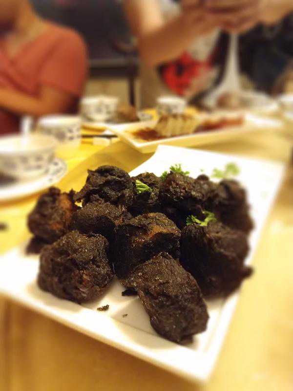 炸岩石:不是华丽的卖相,却是抓人眼球的,勾起一桌人的好奇心。黑漆漆像碳球,里头是蒸熟的丝丁鱼陷,外层勾芡墨鱼汁油炸至酥脆,第一次吃到,听说是快要失传的经典菜肴。