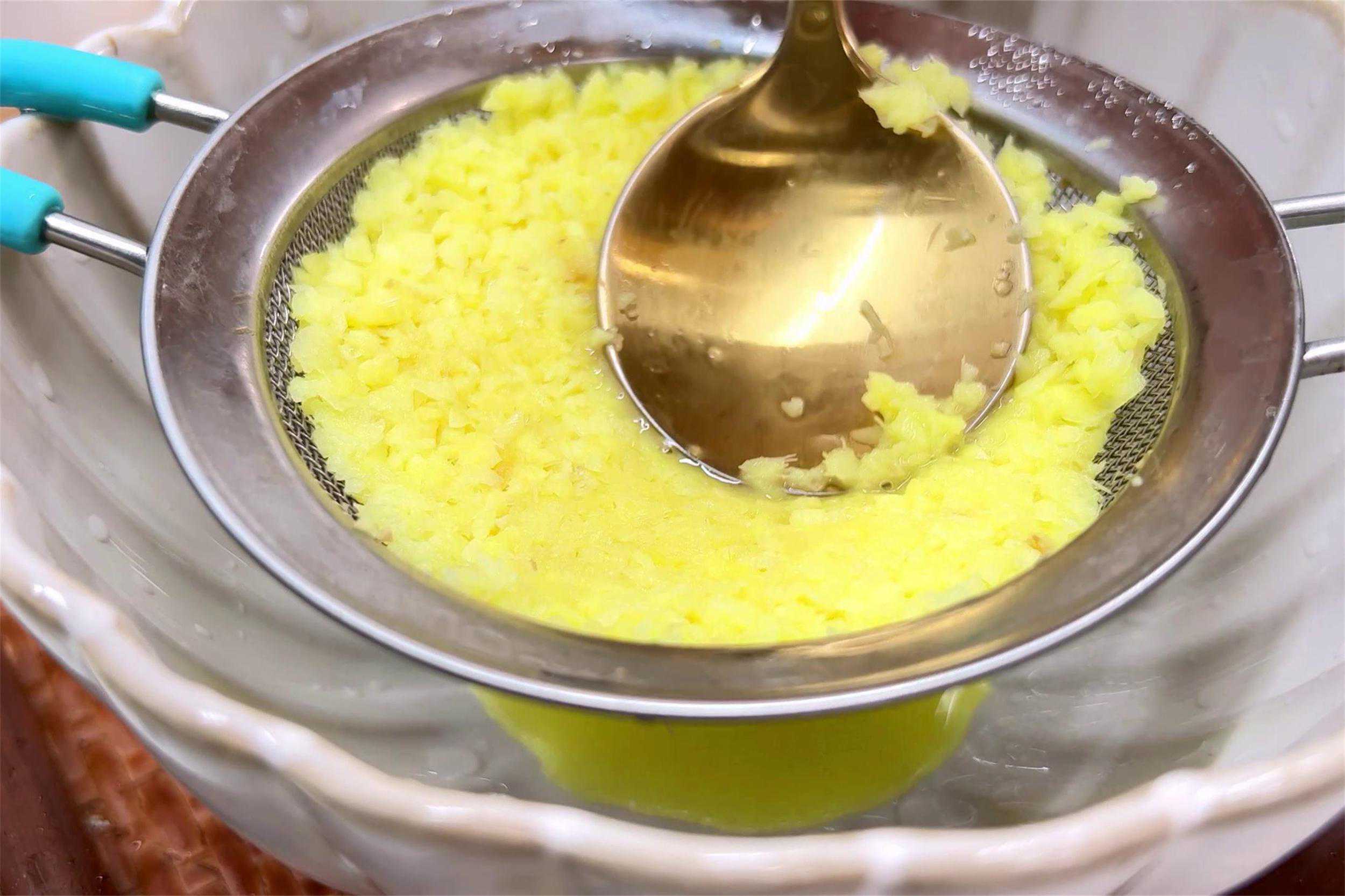 2、把姜末放入滤网或是纱布里,加半勺白糖拌匀静置一会,挤出里面的姜汁,盛出一勺放入碗中。