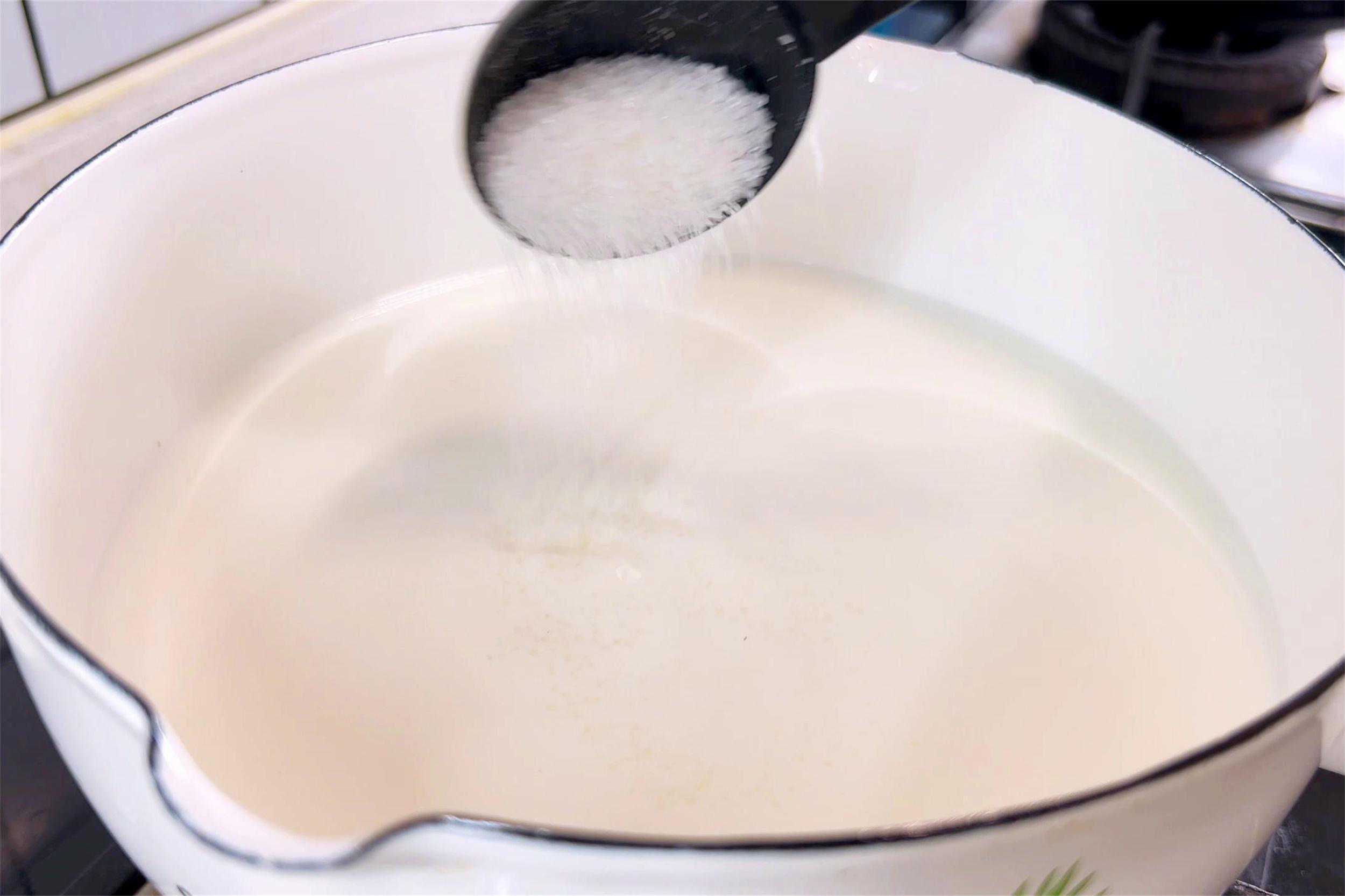 3、将纯牛奶倒入煮牛奶的小锅里,加入一勺白糖,开火加热,煮至锅中有小气泡冒出关火。
