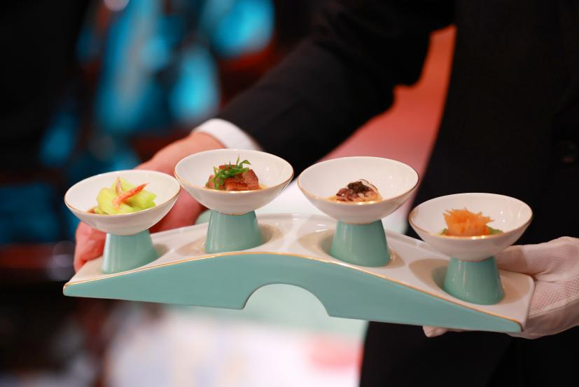 熟醉富贵虾选用6两左右的极品虾姑,使用十年花雕酒熟醉,虾膏丰腴,唇齿留香;章丘鲍芹选用山东章丘鲍芹中段,其色泽鲜亮,搭配秘制油醋汁,口感爽脆且营养丰富;烧椒海蜇花,选用四川秘制烧椒酱搭配海蜇花,口感咸鲜微辣,且有繁荣昌盛的寓意;川味卤三拼选用猪尾,猪舌,猪蹄膀,秘制卤汁卤制而成,肉香浓郁,层次丰富;另外4道美味融合成一道菜品,寓意合作共赢,携手并进!