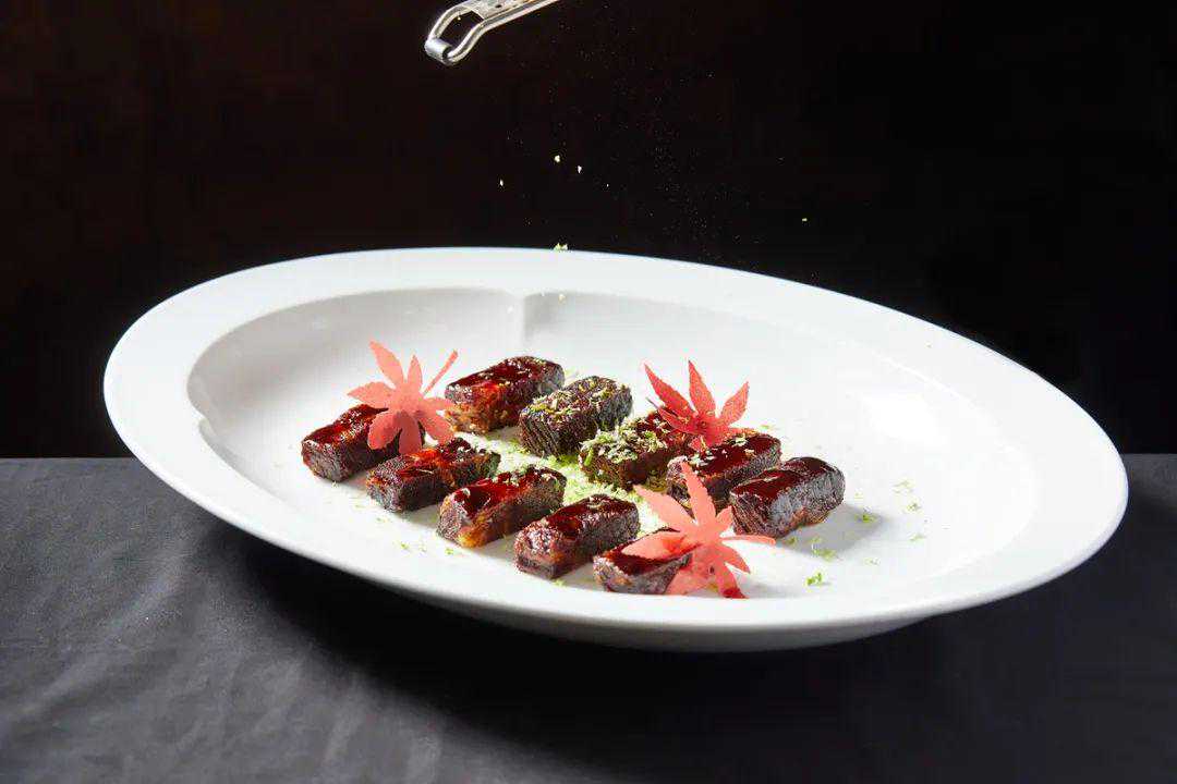 师傅选用M5澳洲和牛肋骨肉,去骨后一头牛只有2kg左右的牛肉可以用来做这道脆皮牛肉。搭配意大利香水柠檬。它的汁水香气浓郁、果皮味道清甜,没有苦涩味,适合搭配牛肉清香解腻。精选意大利20年陈酿黑醋、洋槐蜂蜜搭配主厨独家秘方熬汁酱汁,使这道美味口感浓郁且清香。