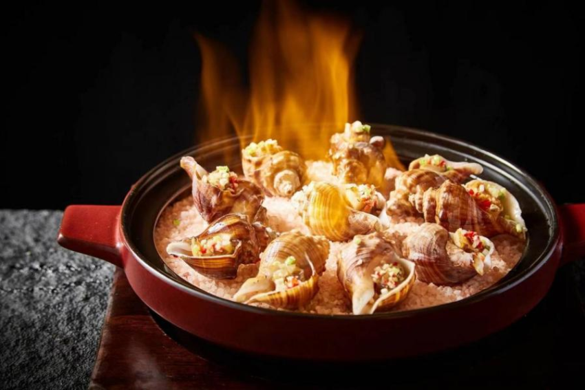 选用大连红螺,之前也是进贡到北京的菜,大连海域水域也是比较优质,没有污染,口感清甜,搭配玫瑰盐垫底,使其色香味俱全。