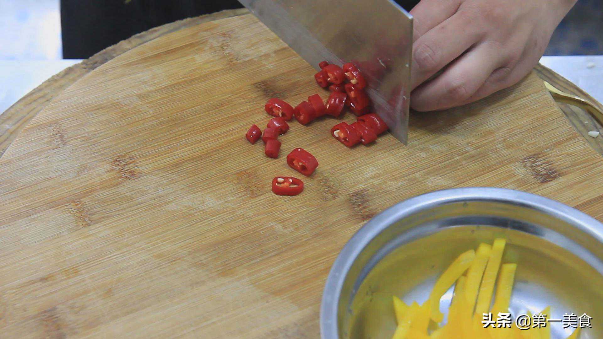 彩椒一片切成辣椒丝,红线椒一个,切成辣椒圈不但出味,还能用来配色。
